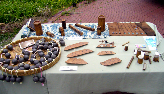竹細工『百竹屋』では、手作りの竹細工(お箸・お皿・楽器)やパチカを売っていました。