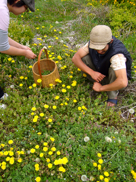 「今日のサラダに使うタンポポの葉っぱをとってるんだよ」との返答。